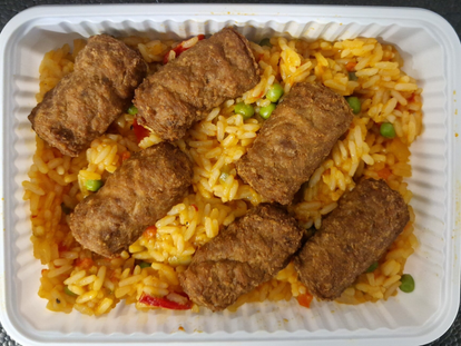 6 Stück Cevapcici, gebraten und deftig gewürzt auf pikantem Djuvec`Reis mit Paprika, Erbsen, Gemüse und Ajvar.