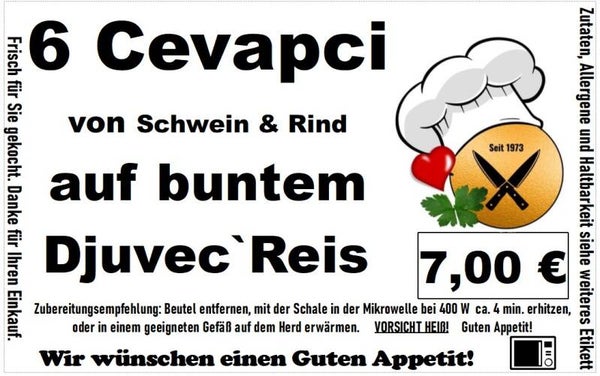Zutaten: Cevapcici (Rindfleisch z.T. fein zerkleinert, Schweinefleisch z. T. fein zerkleinert, Rinderfett, Speisesalz, Gewürze, Knoblauch. 100g Fertigware entspricht 61g Rindfleisch und 56g Schweinefleisch, Rohgewicht in Rapsöl gebraten ) Reis (Trinkwasser, Reis, Paprika, Erbsen, Olivenöl, Speisesalz) Ajvar (84% Paprika und 7% Auberginen, sowie Sonnenblumenöl 4 % , Zucker, Salz, Branntweinessig, scharfe Pfefferoni 1 % und Gewürze)