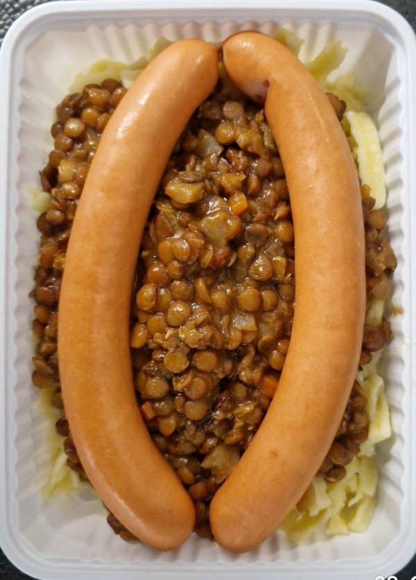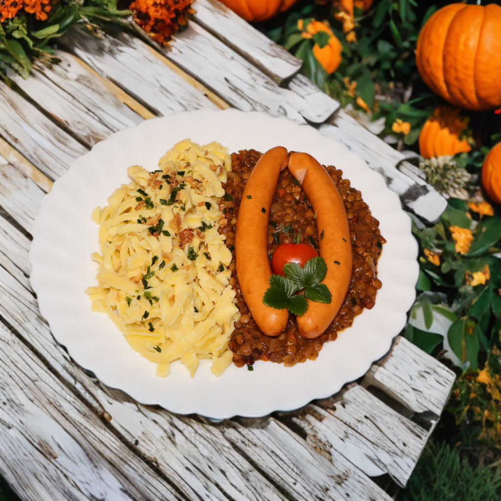 1 Paar Saitenwürstchen auf deftigen Linsen und Butterspätzle. Der genuß, den der Schwabe haben muß.