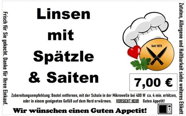 Zutaten: LINSEN (Trinkwasser, Linsen, Räucherspeck (Schweinebauch, Speisesalz, Konservierungsstoff Natriumnitrit, Rauch) Zwiebeln, Möhrchen, SEELLERIE, Lauch, Essig ( Branntweinessig, Weinessig (33 %), natürliches Kräuter-Aroma, Farbstoff E 150 d, Antioxidationsmittel Kaliummetabisulfit) Speisesalz, Speise-Würze, Gewürze (u.a. SELLERIE, SENF) Spätzle (Trinkwasser, Hartweizengrieß, Hühnerei, Speisesalz, Rapsöl, Butter) Saitenwürstchen (Schweine,- u. Rindfleisch 78 %, Trinkwasser, Speck, Kochsalz, Würze, Dextrose, Gewürze, Stabilisator: Diphosphate, Antioxidationsmittel: Ascorbinsäure, Gewürzextrakte, Konservierungsstoff: Natriumnitrit, Schafsaitling, Rauch)